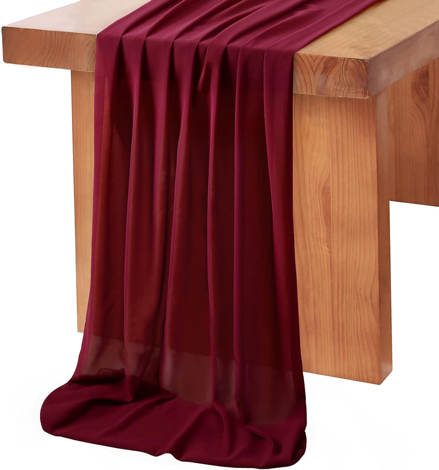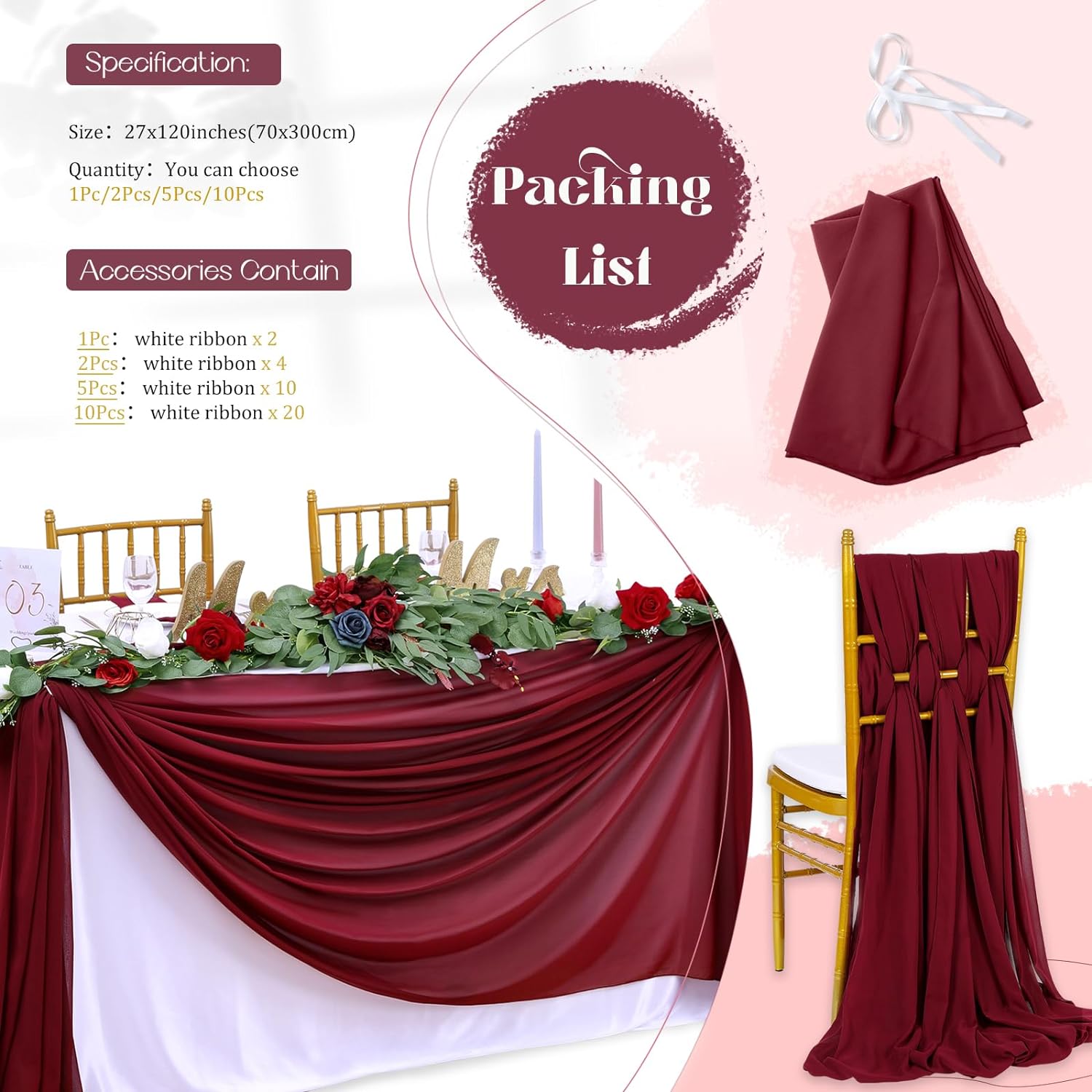 - Burgundy Chiffon Table Runner: 1Pcs 27"width 120"length burgundy table runner with 2 pcs white ribbons. Our burgundy chiffon table runner is fits for 6-10 seats table.