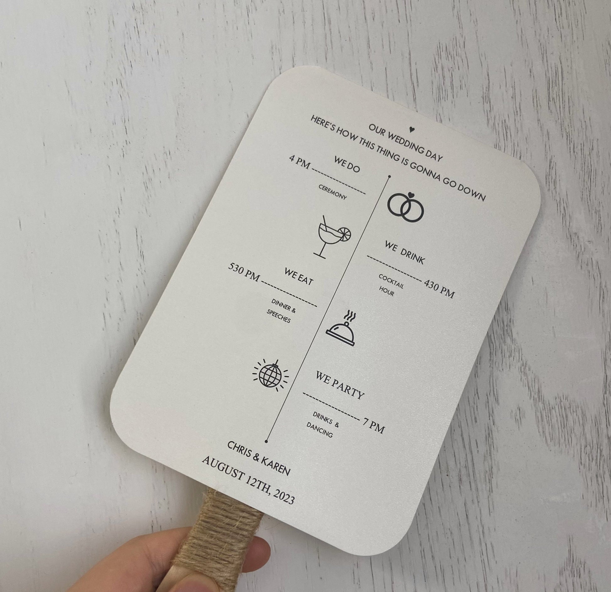 - Make your wedding program useful by having them made into these custom fans! They are 5" X 9.5" DOUBLE SIDED – professionally printed on 110lb cardstock. Fan portion is 5" X 9.5" (with handle- 14.5")